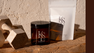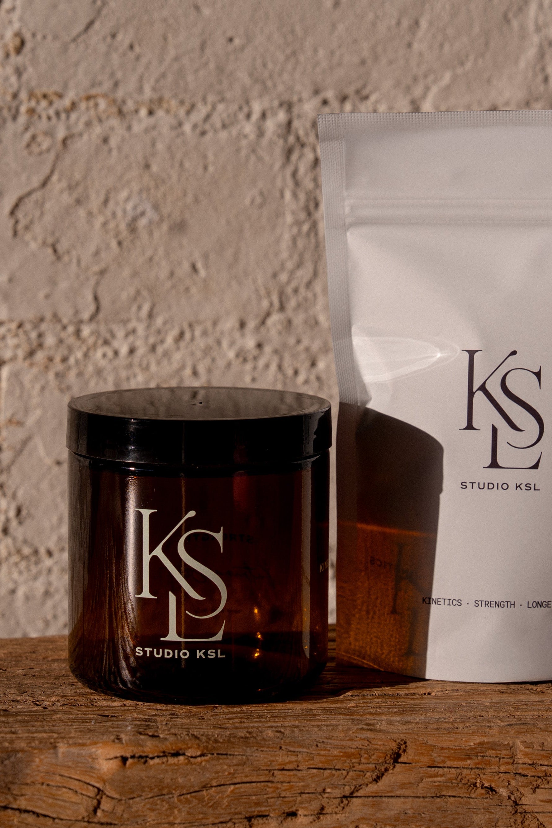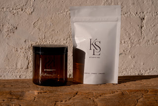 This countertop Studio KSL jar is made from amber glass and features the KSL pillars... Kinetics, Strength & Longevity. The first of a series of sustainable containers that you can use to refill with your Studio KSL wellness essentials.